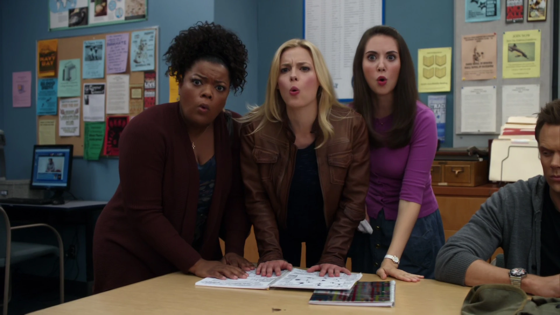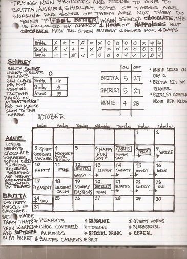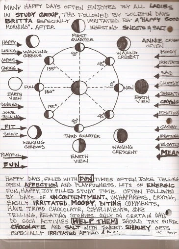 | In the study group's second year at Greendale, Annie's pen went missing one day after they completed another Anthropology diorama project. At Annie's insistence, an intensive search began of Group Study Room F. This escalated into a search of the study group member's personal belongings as Abed had his backpack inspected. Britta noticed Abed's notebook had her name along with Shirley and Annie's inside of it. Included were charts, diagrams and daily logs which Britta realized were monitoring the women's menstrual cycles. An explanation was demanded from Abed who was forced to admit he kept the notebook to improve relations with them. His difficulty with relating to people and accidentally saying inappropriate things happened more frequently with the women in the study group.